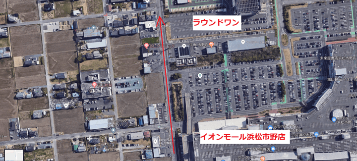「イオンモール市野店」、「ラウンドワン」を右手に見ながら南へまっすぐ進む。